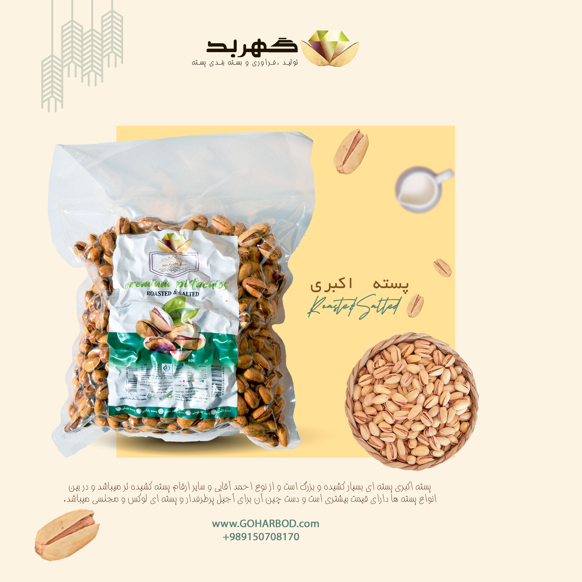 گروه صنایع غذایی گهربد پس از ۱۵ سال فعالیت در حوزه کشاورزی و تولید پسته با اخذ مجوز های لازم از سازمان های مربوطه واحد فرآوری و بسته بندی خود را احداث نمود تا بتواند با کیفیت هر چه بهتر مستقیما محصولات خودرا با قیمت مناسب به مصرف کنندگان ارائه دهد. تمامی محصولات ما از پسته دستچین شده از بهترین نوع انتخاب می شوند. پسته نمکین زعفرانی گهربد به دلیل مرغوبیت و تازه بودن پسته، شما را شیفته خود خواهد نمود. این بسته بندی شامل 6۰۰ گرم خالص پسته بادامی است. پسته بادامی نسبت به پسته فندقی کشیده تر و از پسته احمد آقایی و سایر ارقام پسته کوچکتر و از نظر طعم در کنار پسته احمد آقایی خوشمزه ترین نوع پسته است. این نوع پسته فراوانترین نوع پسته به دلیل مرغوبیت پیوند آن میباشد و به دلیل قیمت مناسب برای آجیل پر مصرف ترین نوع پسته میباشد. این محصول به صورت بسته بندی وکیوم شده ارایه می شود. به طور کلی وکیوم سبب کاهش اکسیژن جوی داخل بسته، محدود کردن رشد باکتری های هوازی و قارچ ها و جلوگیری از فساد مواد می شود. مواد غذایی وکیوم شده، دو الی سه سال ماندگاری دارند و طعم تازگی خود را حفظ می کنند.